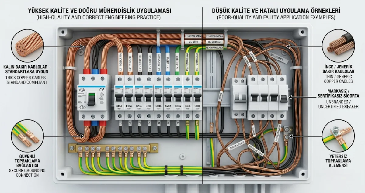 Profesyonel ve dürüst bir elektrik firması, daha fazla kar etmek için asla bu tür ölümcül yollara başvurmaz. İşlemlerinde sadece TSE ve uluslararası CE sertifikalarına sahip, halojensiz tam bakır iletkenler ve global olarak güvenilirliği kanıtlanmış markaların koruma donanımlarını kullanır. Ucuza anlaştığınız bir kişinin duvarınızın içine döşediği standart dışı ince bir kablo, sistem zorlandığında tüm yapıyı küle çevirir. Tesisatınızın güvenliğini garantilemek ve modern standartları yakalamak için pano ve sigorta hizmetleri alırken teknik şartnameleri incelemek ve onaylı ürünlerin kullanılmasını talep etmek tamamen sizin sorumluluğunuzdadır.