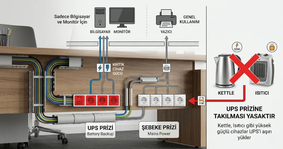 Ofis çalışanlarının kişisel elektrikli ısıtıcılarını, cep telefonu şarj aletlerini, su ısıtıcılarını (kettle) veya vantilatörleri kırmızı UPS prizlerine takması kesinlikle yasaklanmalıdır. Bu yüksek güçlü dirençli cihazlar UPS inverterlerini aşırı zorlar, batarya ömürlerini bitirir ve ciddi bir enerji kaybına yol açar. Tesisatınızda kırmızı prizler sadece bilgisayar kasası ve monitör gibi verilerin kaybolmaması gereken cihazlara ayrılmalı, beyaz prizler ise diğer tüm genel kullanımlar için konumlandırılmalıdır.